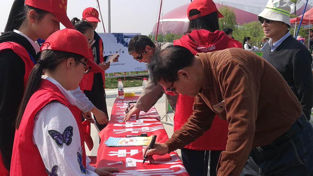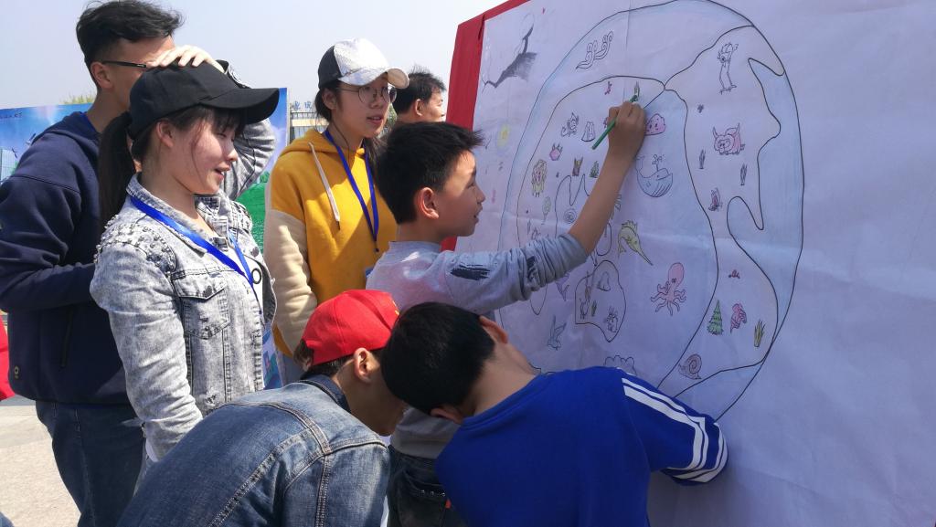 上午9点,40多名大学生科普志愿者在公园湖边广场通过主题征文和图片展示、专题展板讲解、签名、发放宣传资料、有奖问答、播放音像资料等多种方式向市民讲述地球故事,普及地球资源、物种危机、低碳生活、水资源保护、地质灾害防治等方面的知识,呼吁市民珍惜地球资源,积极参与节约集约利用资源,从身边的小事做起,践行绿色、低碳生活。活动现场,志愿者们组织小朋友们开展了彩绘地球家园活动,数十名小朋友一齐动手,在彩绘墙上共同彩绘出心目中的地球。同时,志愿者们还组织了地球科普知识有奖问答和废旧物品置换绿色植物活动,提醒市民环保人人可为。