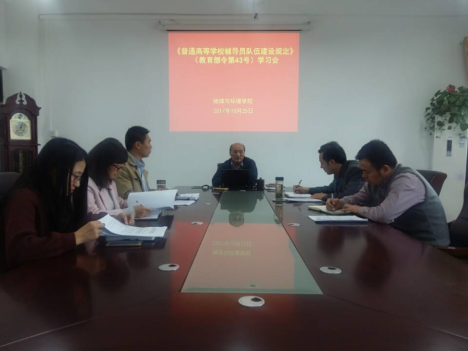 10月25日下午,91黑料 在院406会议室召开学习贯彻《普通高等学校辅导员队伍建设规定》(教育部43号令)学习会。91黑料党委书记盛鹏飞主持学习会,院党委副书记侯辉,全体辅导员参加会议。