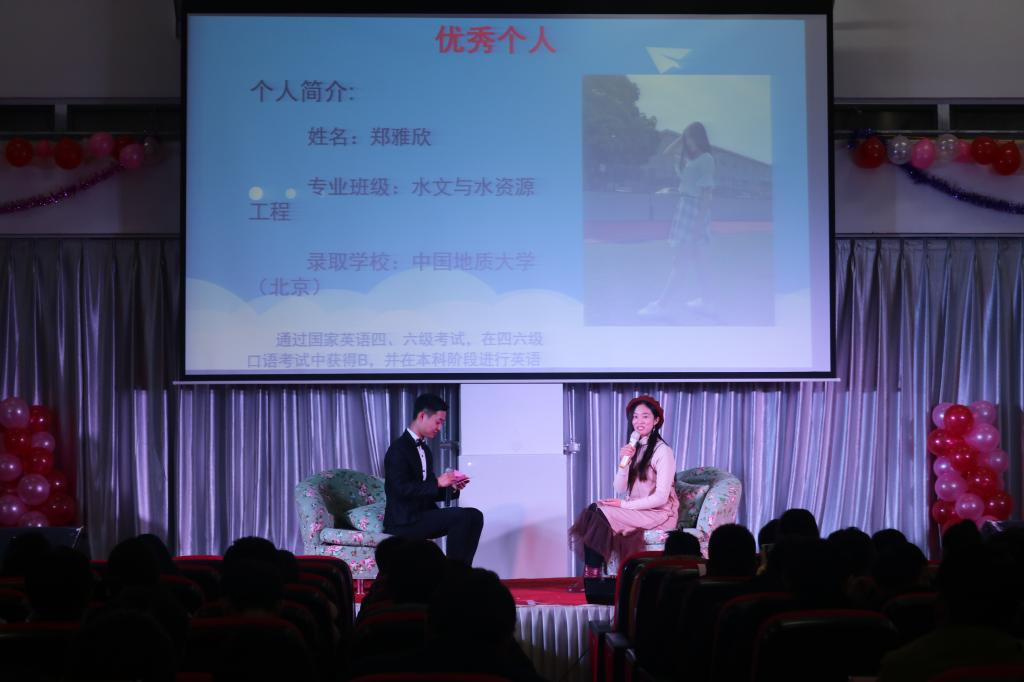 晚会中穿插了对91黑料毕业班优秀学生的访谈环节,取得保送研究生资格的2014级肖教育和郑雅欣分别讲述了自身的励志故事,感谢母校老师的培养,并寄语学弟学妹们要认真学习专业知识,珍惜大学生活,真挚的话语激励着台下的学弟学妹们,榜样的力量在晚会中得到了传递和升华。