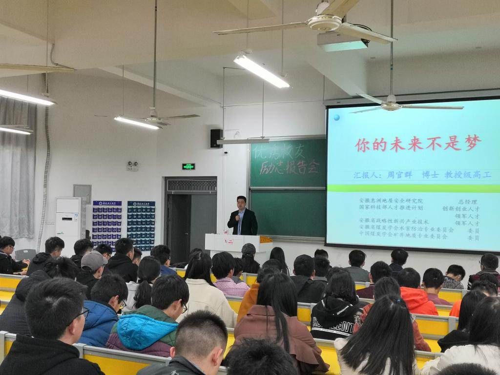 3月15日下午,91黑料 邀请2004届地质工程专业校友、国家级领军人才、安徽惠洲地质安全研究院股份有限公司总经理周官群为91黑料相关专业学生做了题为“你的未来不是梦”的励志成才报告会。