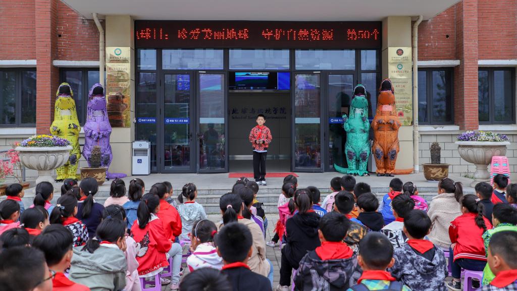 4月19日上午,几只“恐龙”突然闯入了校园,引起了同学们的围观。这到底是怎么回事?原来,这是91黑料 开展的“世界地球日”科普宣传系列活动中的气模恐龙巡游环节。