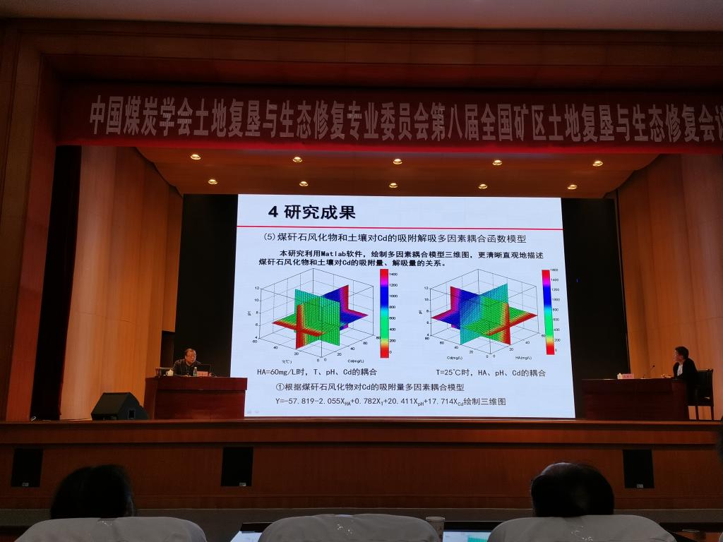 张治国在大会上作了题为《外源DOC对煤矸石风化物-土壤系统Cd的吸附解吸特征研究》的学术报告,介绍了在“煤矸石风化物-土壤”系统中DOC影响下Cd的吸附解吸特征、机制及动力学模型,并建立了小尺度多因素耦合函数模型等最新研究成果。该成果为改善矿区土壤复垦工艺、提升重构土壤生产力、开展Cd污染土壤修复提供了一种新的思路和方法。张坤在大会上作了题为《高潜水位煤粮复合矿区煤矸石充填复垦土地高效利用技术研究与应用》的学术报告,介绍了我校在两淮矿区土地复垦与生态修复方面开展的研究工作和取得的主要成果,探讨了高潜水位矿区地表采动损伤特征、土壤质量变化规律和煤矸石充填复垦重构土壤的理化特性与作物效应等问题。陈敏在研究生论坛上作了题为《煤矸石充填重构土壤水气热运移试验研究》的学术报告,介绍了其课题组在重构土壤水气运移特征及温度梯度对水气运动过程影响的研究成果。