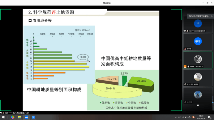 张世文教授从“他是谁”、“怎么评”、“如何用”这三方面介绍了我国土地资源基本情况,并通过详实案例介绍了旱作肥沃耕层的构建、农田重金属的修复,工矿废弃地的复垦。他指出保护治理自然环境,节约集约利用土地资源,保障粮食安全是我国的重要国策,呼吁大家共同关注自然资源,增强全民保护耕地的意识,营造珍惜土地资源的良好氛围。