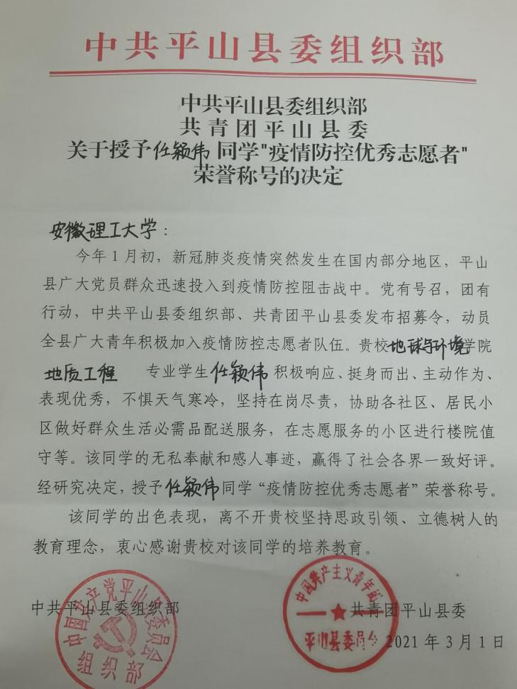 近日,河北省平山县县委组织部向我校发来抗疫感谢信,对我校学子志愿参加平山县疫情防控表示衷心的感谢!信中表示:学子的优秀表现离不开安徽理工大学坚持思政引领,立德树人的教育理念,衷心感谢学校对该同学的培养和教育。