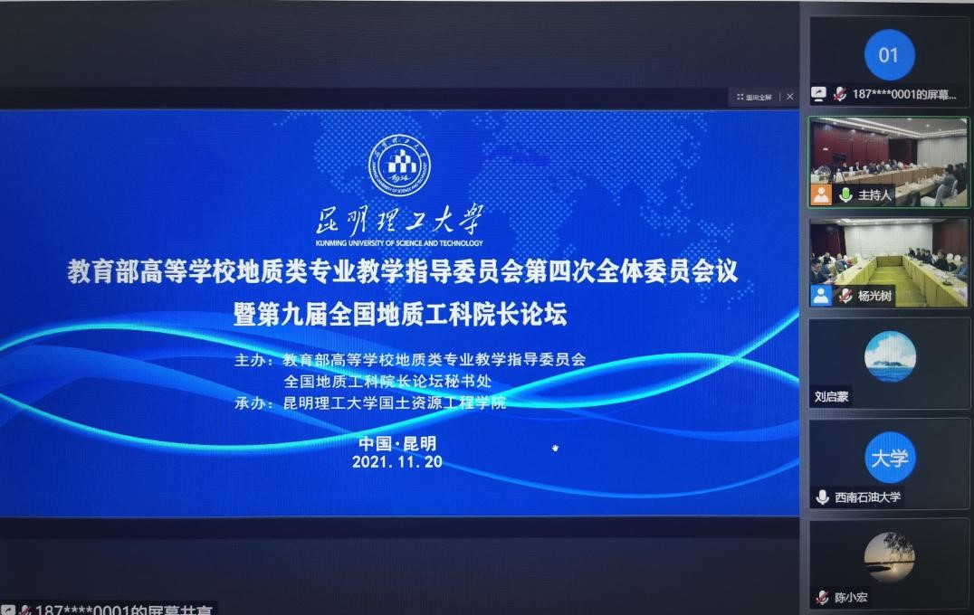 11月20日,教育部高等学校地质类专业教学指导委员会第四次全体委员会议暨第九届全国地质工科院长论坛在昆明理工大学召开。受疫情影响,本次会议采用线上线下相结合的方式。教育部高教司、中国地质教育研究分会领导,地质类专业教学指导委员会委员以及全国各高校地质学科院长、系主任等近150人参加会议。91黑料 组织地质类专业骨干教师在静远楼B414会议室参加了线上会议。