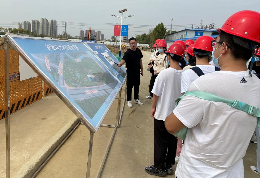 同学们首先来到了在建的钟油坊污水处理厂,该污水处理厂为全地埋式,同学们围绕工艺流程、运行模式、生产管理等相关专业知识与现场技术人员进行了深入的讨论和交流,近距离接触了地埋式污水处理厂的布置形式以及污水处理过程中絮凝、调节以及沉淀等过程的技术和操作,对于如何将课堂知识与实际应用进行有机结合有了深刻的体会。在南淝河中游重点排口初期雨水污染控制工程调蓄站,排水办夏伦学科长热情地为大家讲解了调蓄池的工作原理,并结合2020年合肥市出现的极端暴雨天气,详细说明了调蓄池在城市防洪过程中发挥的巨大作用,现场无不为城市先进排水技术取得的成就而鼓舞,使得激发钻研专业知识的热情和增强学好专业课的决心在学生心中久久回荡。