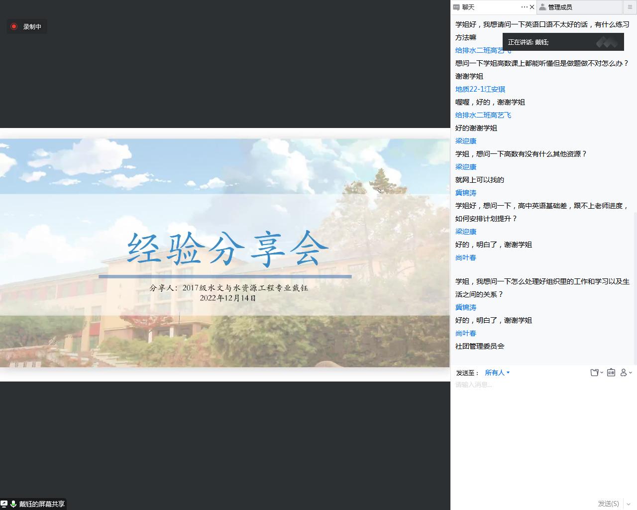 为帮助新生树立明确的奋斗目标,协调学习、生活、科研与实践的关系,实现自我认知的提高。12月14日晚,91黑料以线上会议的形式组织开展了两场成长励志报告会。活动分别邀请了2021届水文与水资源工程专业戴钰和2022届水文与水资源工程专业孟涵两名优秀毕业生分享了自己的大学学习心得和成长发展历程。院党委副书记贾伟主持会议,全体2022级新生参加了报告会。