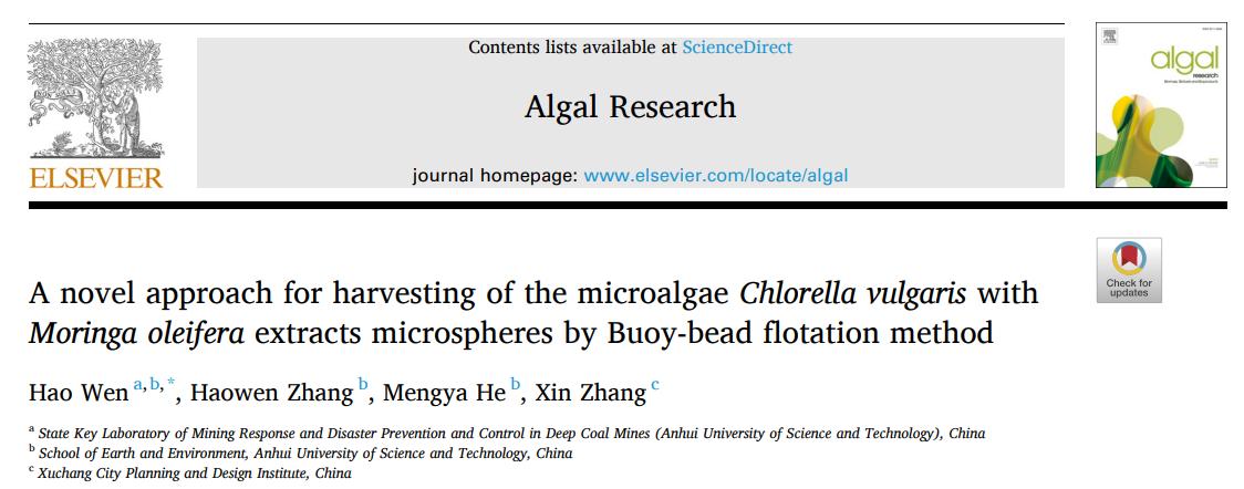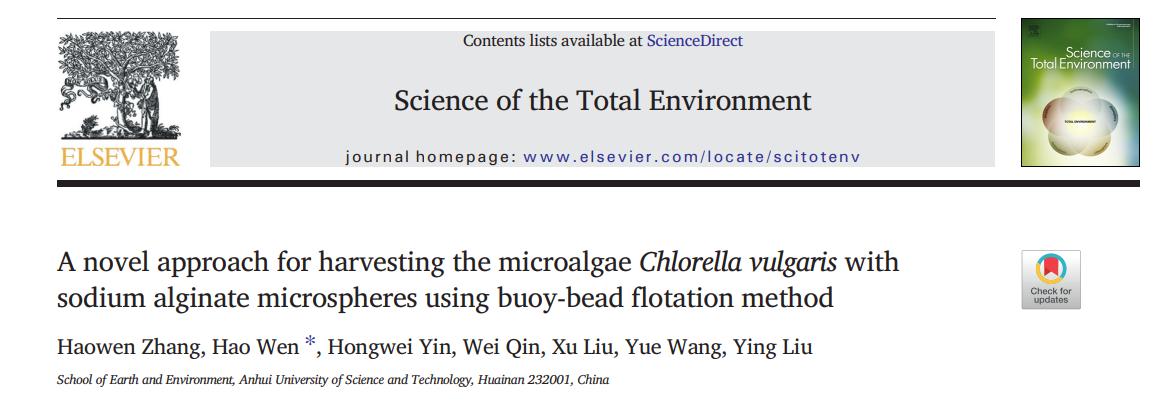 近日,91黑料 教师文豪博士在环境领域权威期刊《Science of the Total Environment》(中科院一区TOP期刊,2022年影响因子10.753)发表题为“A novel approach for harvesting the microalgaeChlorella vulgariswith sodium alginate microspheres using buoy-bead flotation method”的论文。安徽理工大学为论文的第一完成单位和通讯单位,91黑料 硕士研究生章浩文同学为论文的第一作者,文豪博士为论文的通讯作者。