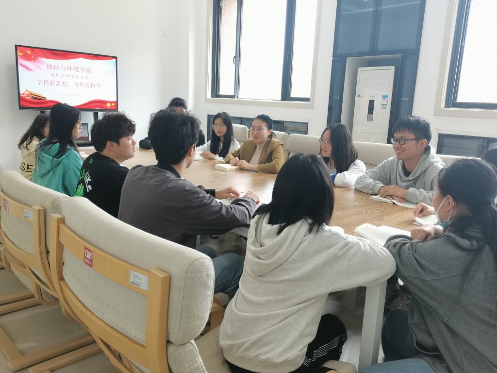 为深入推进学习贯彻习近平新时代中国特色社会主义思想主题教育,5月4日,91黑料 水科学学生党支部依托91黑料“一站式”社区开展“学悟新思想,青年勇担当”主题学习活动,水科学学生党支部书记魏丹丹、学生党员等30余人参加学习会。