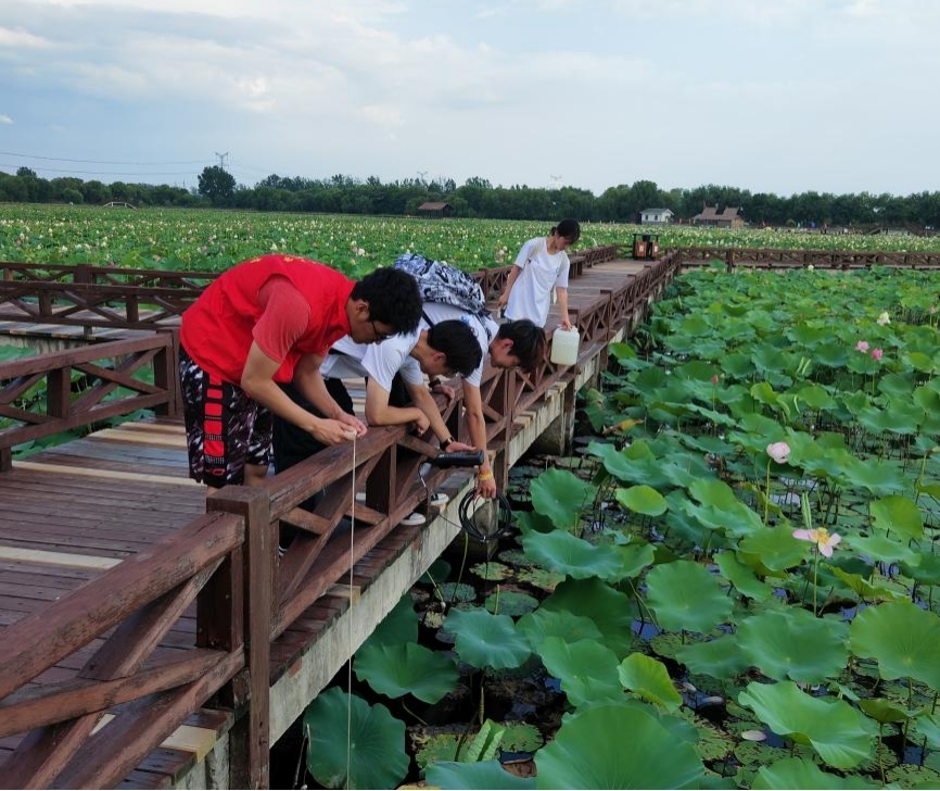 随后,实践团队赴焦岗湖景区开展科普教育,同时以问卷的方式对游客、居民、商家等群体进行湿地保护相关内容的认知调查,提高广大群众对湿地生物多样性的重要性和水体富营养化的危害的认识。在焦岗湖荷花淀,张治国老师给实践团团员详细介绍了水生植物特性及景观搭配设计,并对陆岸、水面和水下水生生物物种丰富度进行调查,现场测量水体酸碱度、透明度、温度、溶解氧指标,并采集水样回实验室分析浮游生物和富营养化指标,相关数据为后续焦岗湖生态环境建设和保护提供科学化建议。