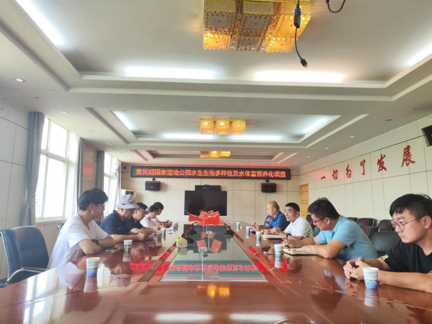 在焦岗湖管委会,志愿服务团队成员与工作人员就湿地保护进行了座谈交流。会上,谢士峰副主任对志愿团表示了欢迎,详细介绍了焦岗湖国家湿地公园现状以及湿地保护开展的重要措施,提出进一步加强校企产学研一体化合作,服务湿地保护工作的愿景。实践团队就湿地保护一些问题与相关负责人进行了深入交流,并参观了焦岗湖信息化管理平台。