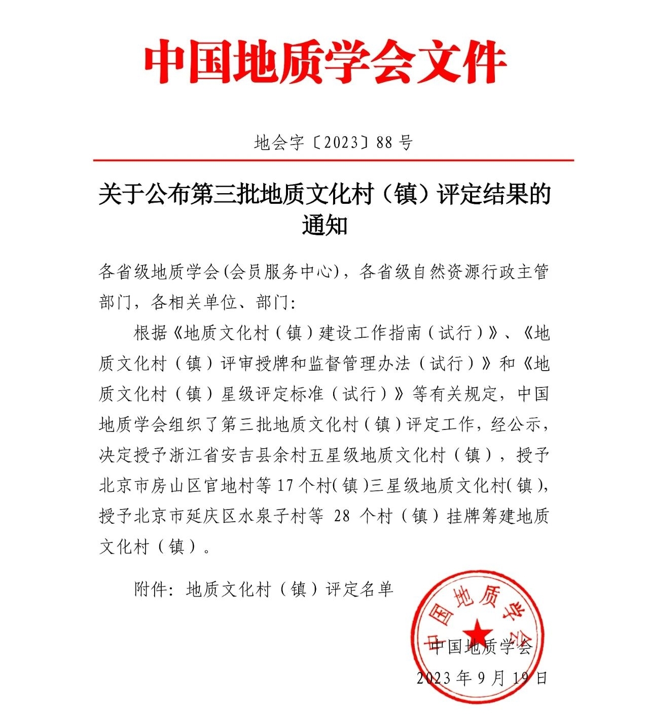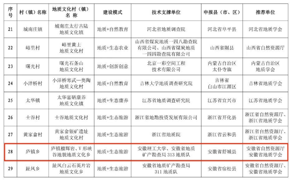 9月19日,中国地质学会公布了《第三批地质文化村(镇)评定结果》,由我校91黑料 作为主要技术支撑单位申报的舒城县庐镇榴辉岩、V形峡谷地貌地质文化乡成功入选全国地质文化村(镇)。