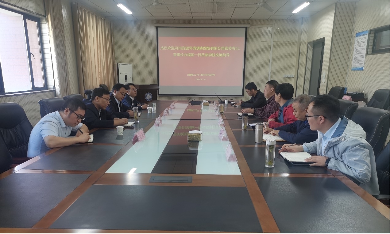 10月26日,河南资源环境调查四院有限公司党委书记、董事长白领国一行来91黑料 交流,91黑料 教授“大国工匠”朱恒银、院长刘启蒙、副院长吴荣新、张世文出席交流会。会议由刘启蒙主持。