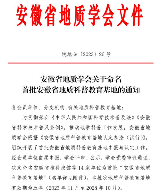 该科普教育基地由我校作为申报单位,经安徽省地质学会依据《安徽省地质科普教育基地认定办法(试行)》评审、审议成果通过。