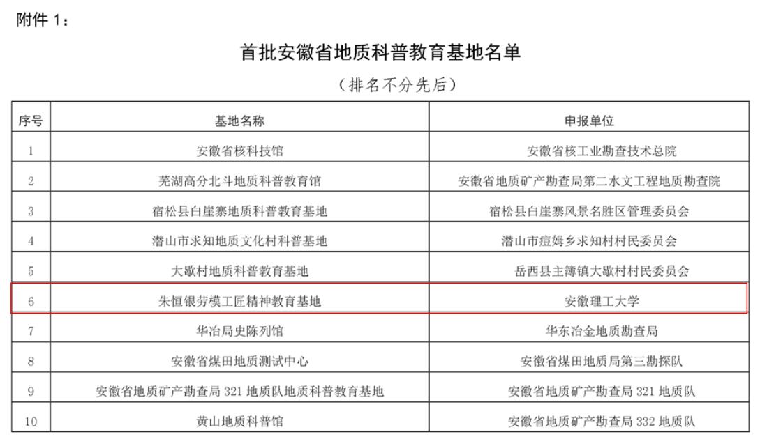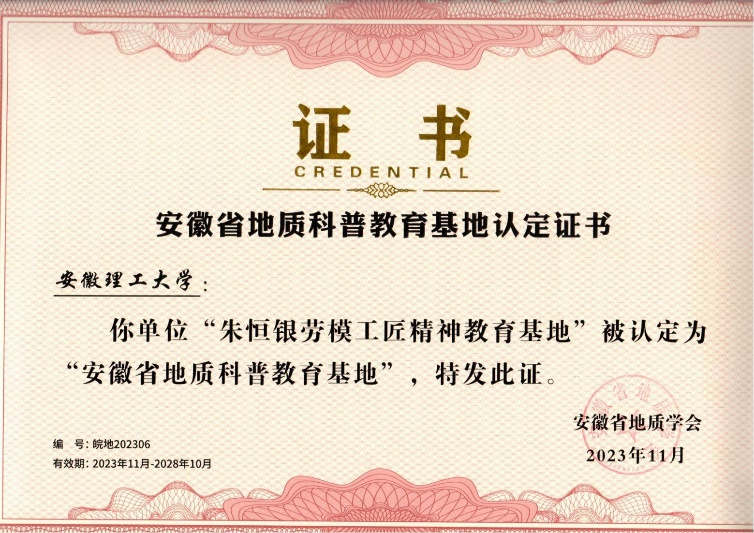 11月20日,安徽省地质学会公布首批安徽省地质科普教育基地评选结果,全省共有14所科普教育基地入选。安徽理工大学申报的“朱恒银劳模工匠精神教育基地”成功获批。