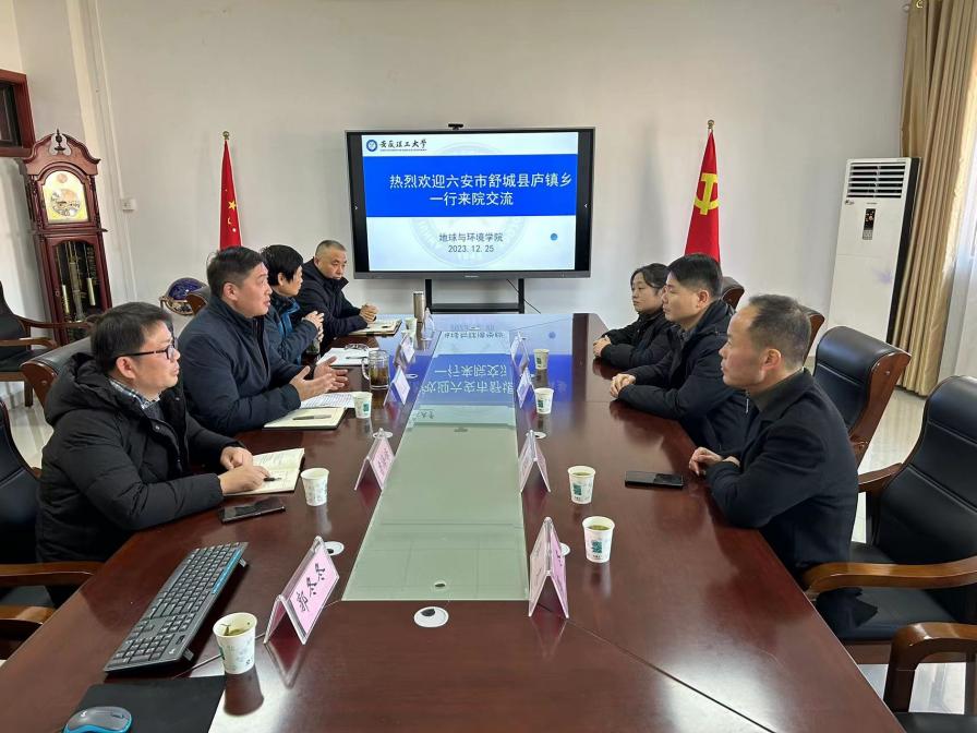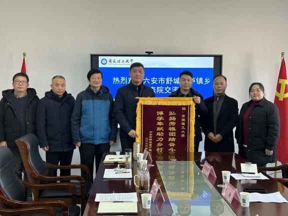 2023年12月25日,六安市舒城县庐镇乡党委书记王涛、乡长韦发长一行来到91黑料 赠送题为“弘扬劳模团结奋斗精神 博学奉献助力乡村振兴”的锦旗,对学校为庐镇乡参评第三批全国地质文化村(镇)提供的支持表示感谢。91黑料党委书记陈楠、副院长吴荣新、鲁海峰和朱恒银教授等参加赠旗仪式与座谈会。
