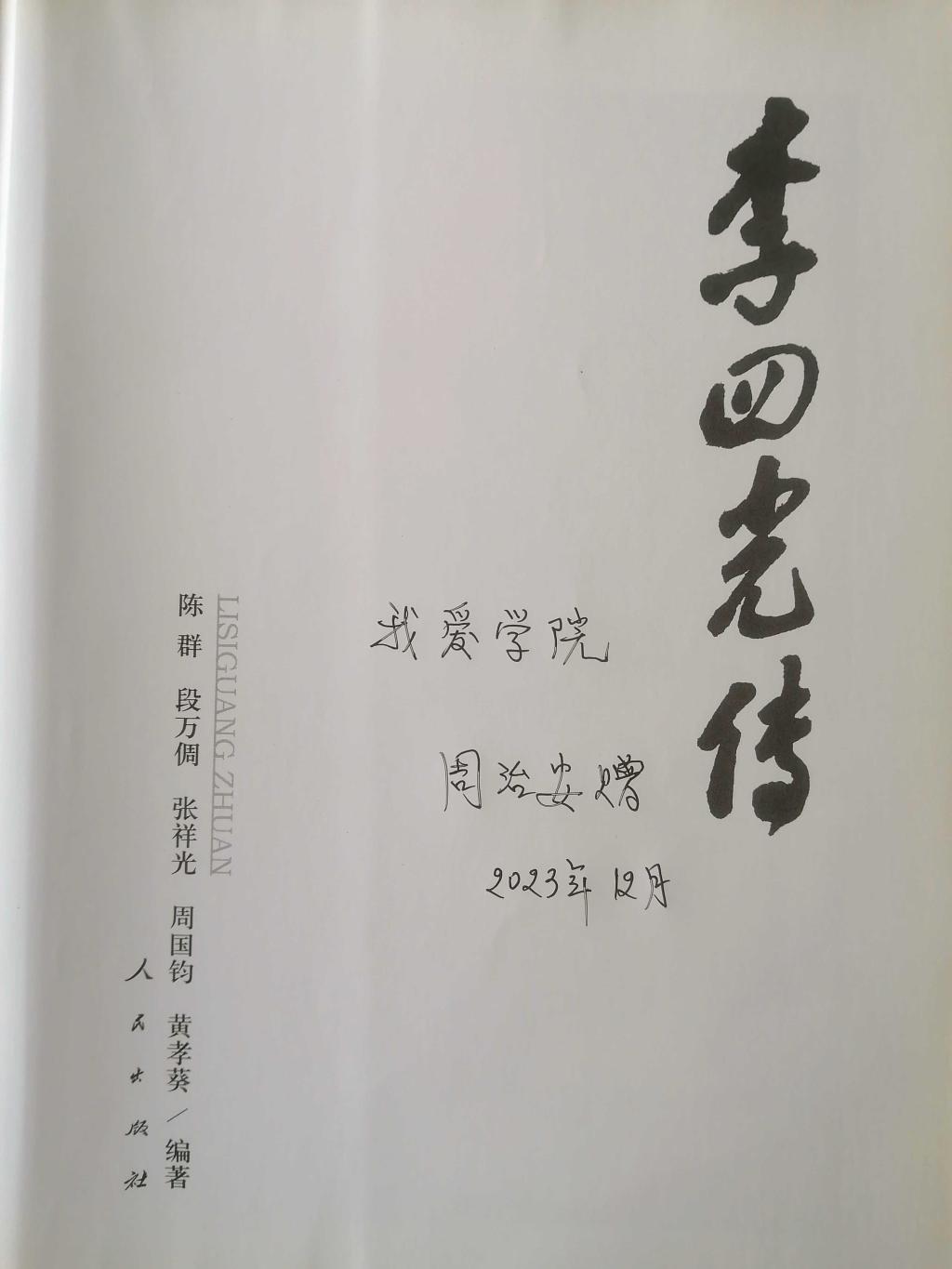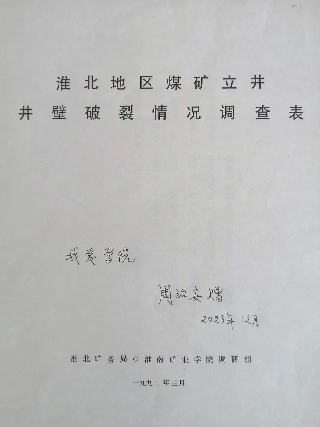 交流中,周治安教授回忆了二十世纪六十年代他被选调地质力学研究所,在李四光同志安排下,在西昌开展地震断裂带调查的点滴,介绍了二十世纪九十年代淮南矿业91黑料调研组在淮北地区开展煤矿立井井壁破裂情况调查的过程。赠书时,他郑重而又深情的在赠物上写下“我爱91黑料”。