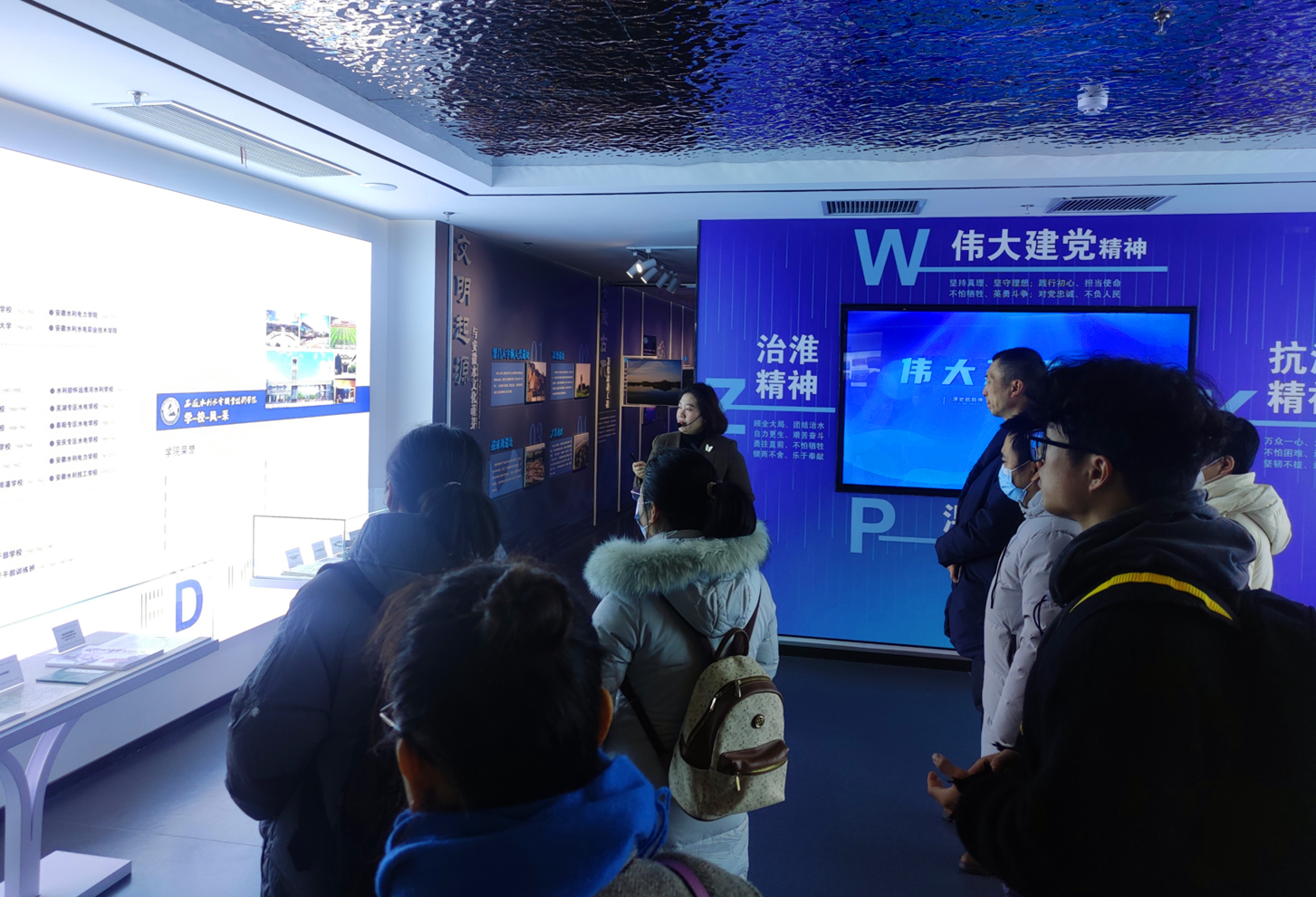 在安徽水情教育基地,党支部教师先后观看了省内水情、治水成就、水利精神、水文化的展示,感怀先辈们在党的领导下,战天斗地、兴修水利,保障社会经济发展和人民安居乐业的光辉历史,学习新时代基于水利现代化的要求,为实现江河安澜、美好安徽,开展智慧水利建设、河湖生态保护和水环境治理所取得的新成就。