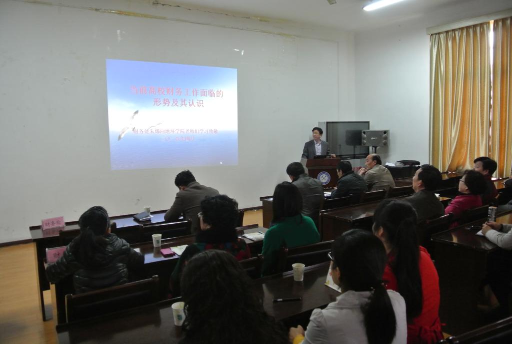 会上,学院首先邀请财务处朱炜处长为全体教职工做了题为《当前高校财务工作面临的形势及其认识》的辅导报告。报告中,朱处长从“当前学校财务工作新形势”等五个方面,详细介绍了国家、省、市以及学校财务工作面临的新形势、新问题和新挑战,对国家财务政策及学校相关报账工作做了详细解释和说明。