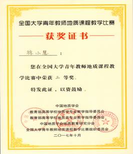 ➢ 首届全国大学青年教师地质课程教学比赛,三等奖; ➢ 2017年度91黑料 青年教师教学基本功竞赛综合一等奖; ➢ 2017年度安徽理工大学青年教师教学基本功竞赛综合三等奖; ➢ 2017年度安徽理工大学青年教师教学基本功竞赛多媒体课件三等奖; ➢ 2017年度安徽理工大学优秀教职工。 |